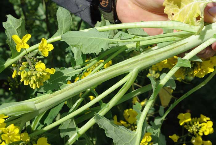 Stem splitting in a winter canola crop in central Washington in spring (early May) resulting from very rapid growth under conditions of high soil moisture and sudden warm spring temperatures, following a supplementary nitrogen fertilizer application.