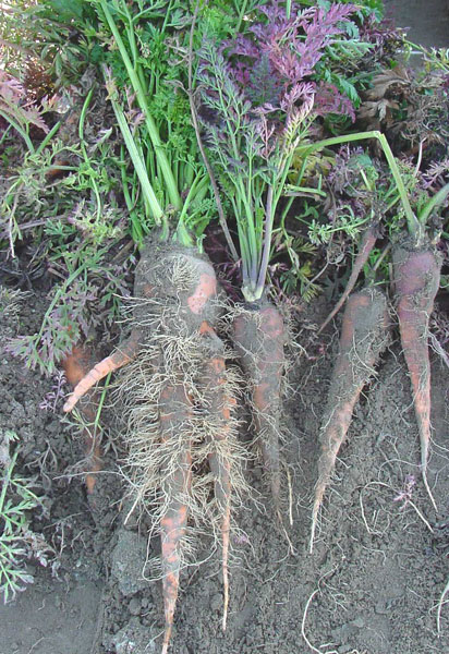 Extension Network Sites > Pacific Northwest Vegetable Extension Group > Carrot phytoplasma and spiroplasma infection Carrot phytoplasma and spiroplasma infection Phytoplasma infection of carrot showing hairy roots and purple-bronze foliage.Photo Source: Lindsey J. du Toit ↑ Back to top