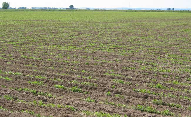 Patches of stunted plants in a coriander seed crop caused by root knot nematode.