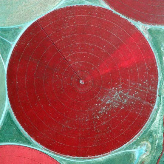 Infrared, aerial photo of an onion bulb crop in the Columbia Basin of Washington showing areas of stunted patches (red = healthy crop canopy).