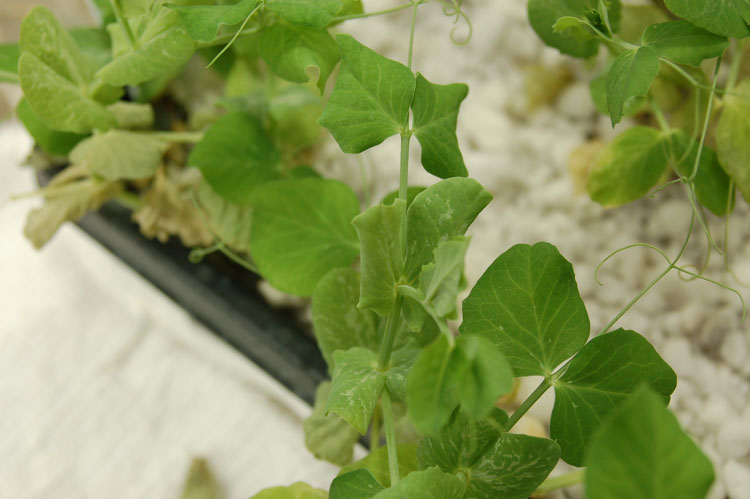 Extension Network Sites > Pacific Northwest Vegetable Extension Group > Pea fusarium wilt Pea fusarium wilt In addition to chlorosis of the lower leaves, symptoms of Fusarium wilt can include down-turned leaves.