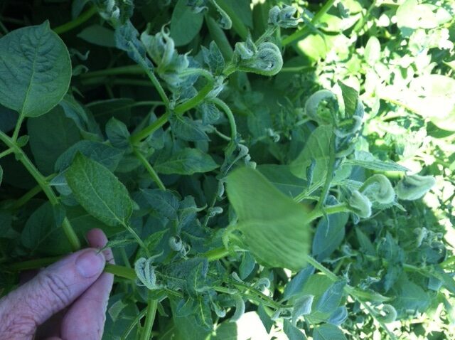 Symptoms of injury from drift of the herbicide 2,4-D into a potato crop.