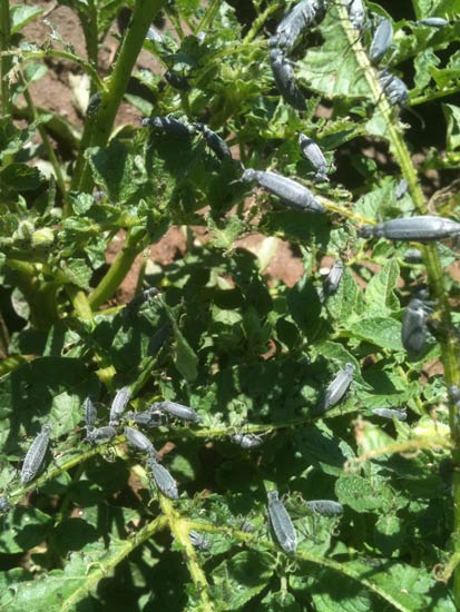 Blister beetles defoliated a short section of an outside row of a potato crop, but did a little damage beyond that. The potato crop was adjacent to rangeland that had a lot of grasshopper eggs on which blister beetle larvae feed.