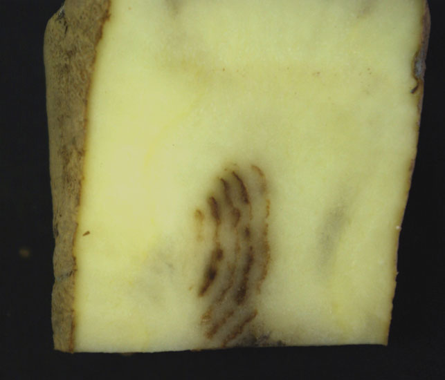 Symptoms of Potato mop top virus infection of tubers of various potato cultivars.