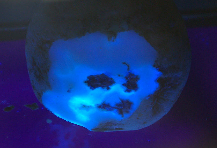 A potato tuber illuminated with ultraviolet light, glowing as a result of pink eye.