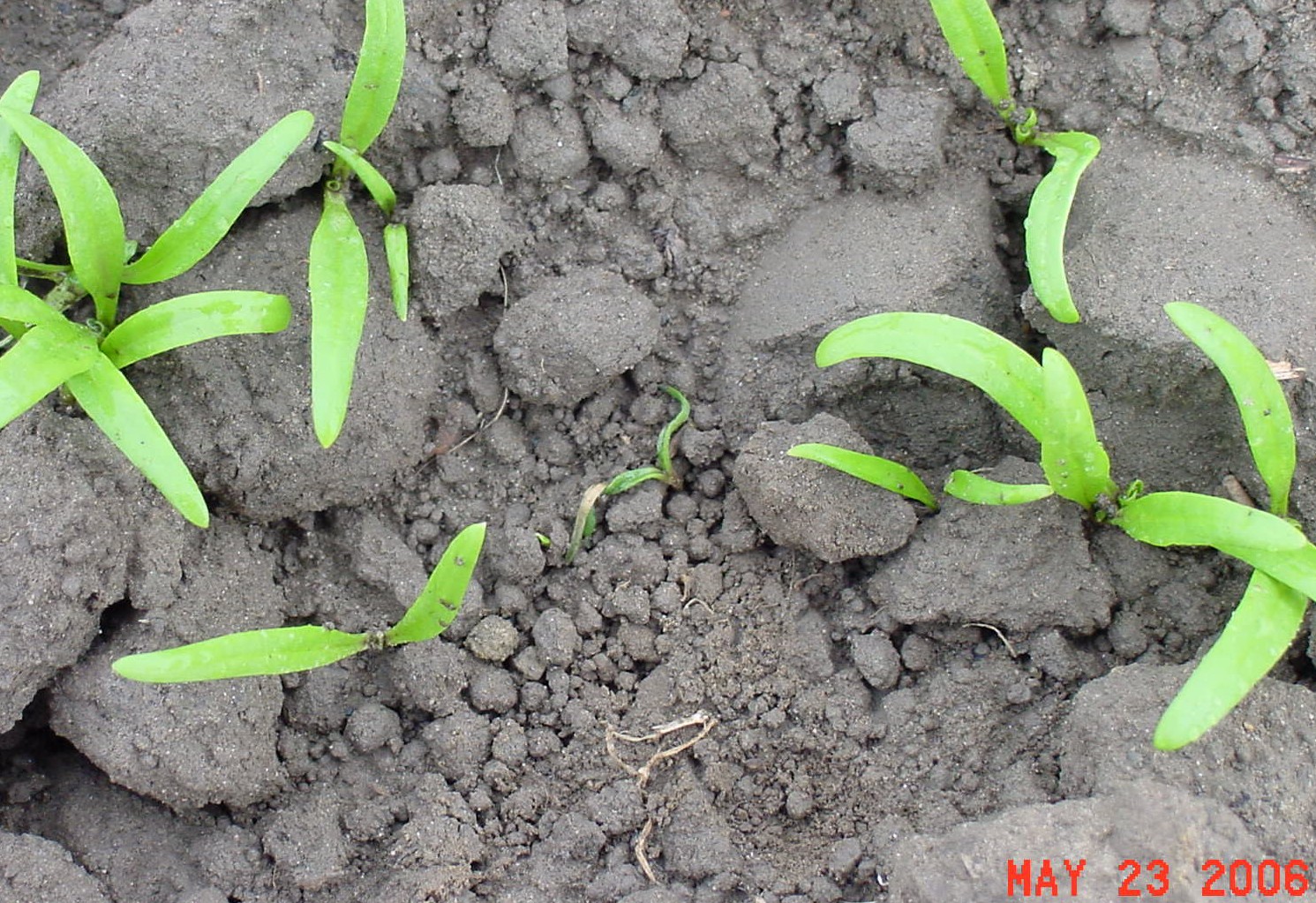 Post-emergence damping-off of spinach seedlings. Note the wilted and dead seedlings in the center of the photo.
