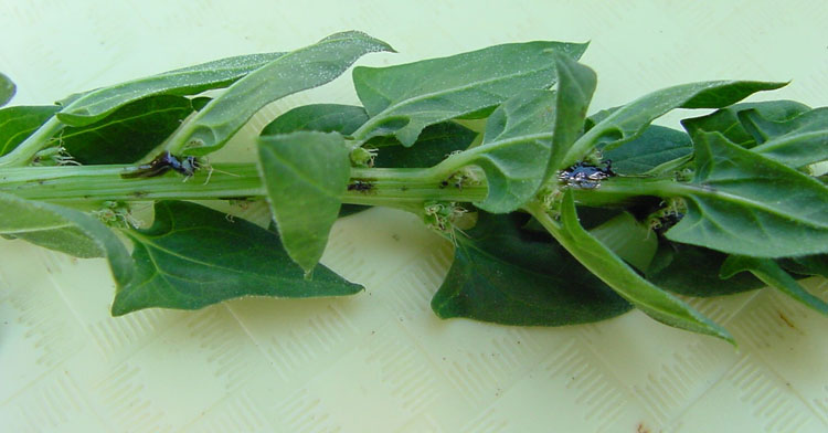Lygus bugs cause damage in spinach seed crops by feeding on the developing flowers and seed. A black sticky substance is often produced at the site of feeding injury.