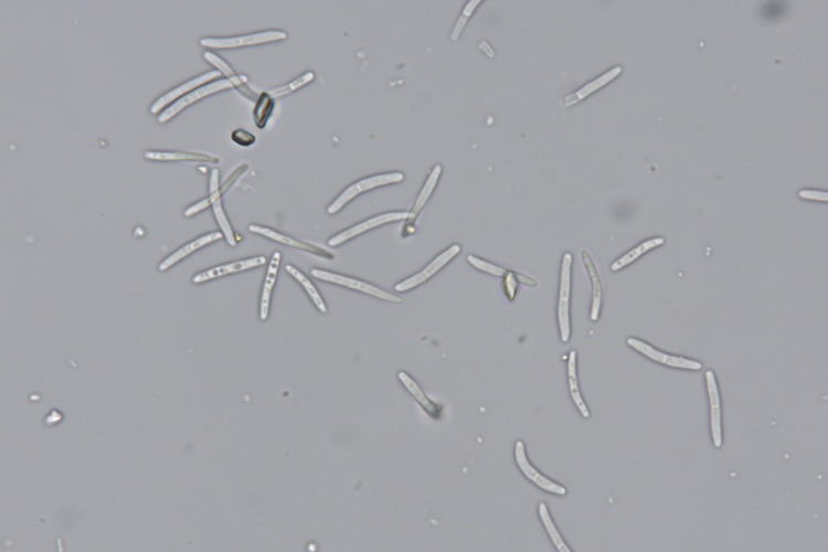 Two-celled, hyaline spores of Ramularia beticola from an infected Swiss chard leaf.